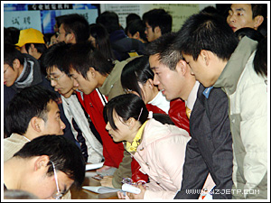 12月11日,由省教育厅主办、下沙高教园区六所高职院校联合承办的浙江省2006届高校毕业生高职类专场招聘会在我院举行。此次招聘会是浙江省教育厅首次组织的高职类毕业生专场大型招聘会,参会单位有三百余家,其中不乏有浙江农资集团、浙江新大集团、杭州制氧集团、松下集团、杭州汽轮机集团、杭州宋城集团等一些知名企业。据不完全统计,此次参会单位带来了2000多个岗位。尽管天下着小雨并吹着冷飕飕的风,但这丝毫不减求职大军们火一样的热情,在杭高职院校及湖州、台州、温州等省内外的高职院校约1.5万名毕业生人前来应聘,不少本科院校和省外的毕业生也闻讯纷纷赶来应聘,约1000名毕业生与用人单位达成了初步意向。省教育工委副书记、教育厅副厅长蒋胜祥及教育厅学生处处长周加敏等领导亲临招聘会现场指导。浙江卫视、《浙江日报》、《钱江晚报》、《浙江教育信息报》等多家知名媒体对本次招聘会进行专门报道。
