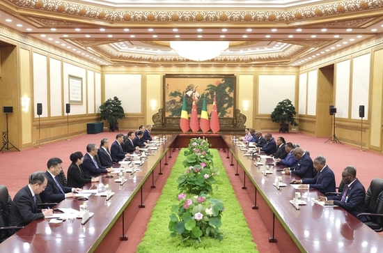 9月4日中午,国家主席习近平在北京人民大会堂会见来华出席纪念中国人民抗日战争暨世界反法西斯战争胜利80周年活动的刚果(布)总统萨苏。两国元首宣布将双边关系定位提升为中刚高水平命运共同体。